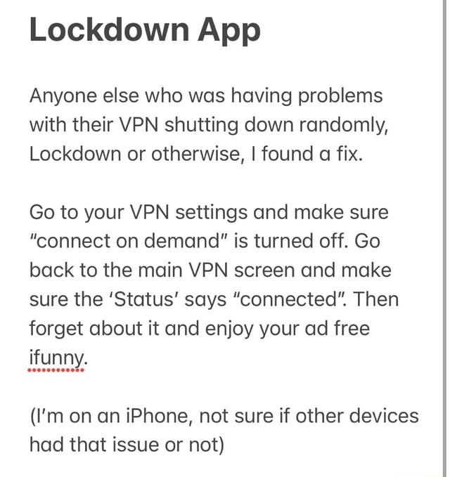 Lockdown App Anyone Else Who Was Having Problems With Their Vpn Shutting Down Randomly Lockdown Or Otherwise I Found A Fix Go To Your Vpn Settings And Make Sure Connect On Demand