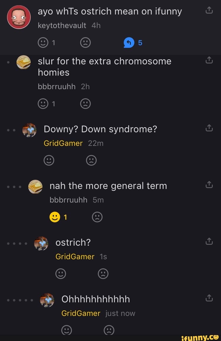 Ayo Whts Ostrich Mean On Ifunny Keytothevault Slur For The Extra Chromosome Homies Bbbrruuhh Downy Down Syndrome Gridgamer Nah The More General Term Bbbrruuhh Sm 1 Ostrich Gridgamer Obhhhhhhhhhh Gridgamer Just Now